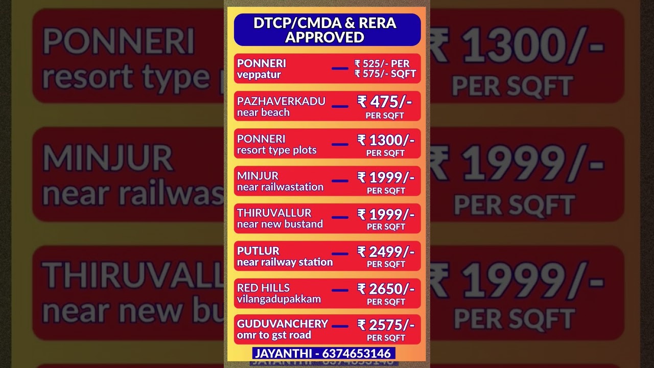 π‘ Residential Plot Investment Opportunities This list presents various residential plot options in and around the Chennai area, Pazhaverkadu | ₹ 475 | DTCP Approved | Ultra-Low Budget Investment: This is the most affordable option, ideal for long-term investors looking for plots far from the city center, potentially near the coast or Pulicat Lake area. DTCP approval ensures basic legal compliance. Ponneri Veppatur | ₹ 525 / ₹ 575 | DTCP Approved | Budget-Friendly Near Key Hub: Located in the Ponneri region, which is emerging as an economic and industrial hub. The low price makes it suitable for budget-conscious buyers seeking DTCP-approved land in a developing area. Ponneri Medhur | ₹ 1,300 | DTCP Approved Mid-Range Ponneri Property: A significant step up in price compared to Veppatur, suggesting proximity to better infrastructure, main roads, or the core developing areas of Ponneri. Suitable for slightly quicker appreciation potential within the same region. Minjur | ₹ 1,999 | DTCP Approved Developing Northern Hub: Minjur is a major area in North Chennai, often favored for its connectivity to the city and ports. This price point reflects a desirable DTCP-approved plot in an established suburban town with good growth prospects. Thiruvallur | ₹ 1,999 | DTCP Approved Western Corridor Potential: Located west of Chennai, Thiruvallur is a district headquarters. This price indicates plots within a well-developed, DTCP-approved layout, offering connectivity via rail and road on the western side of the metropolitan region. Putlur | ₹ 2,499 | DTCP Approved | Premium Thiruvallur Region Plot: This higher price compared to general Thiruvallur plots suggests a prime location within the area, potentially closer to the city, a major transport link (like the railway station), or within a premium DTCP-approved project. Guduvanchery | ₹ 2,575 | DTCP Approved | Thriving Southern Corridor: Situated on the GST road (National Highway 45), Guduvanchery is one of the fastest-growing areas in South Chennai due to proximity to IT and industrial hubs (like SRM University and Mahindra World City). DTCP approval here is highly sought after for immediate development or investment. Redhills | ₹ 2,650 | CMDA Approved | Closest to Core City & CMDA Advantage: Redhills is geographically closer to the main city of Chennai compared to most other sites on this list. CMDA (Chennai Metropolitan Development Authority) approval is generally considered the highest standard and is essential for locations within the Chennai Metropolitan Area (CMA), justifying the premium price. call 6374653146